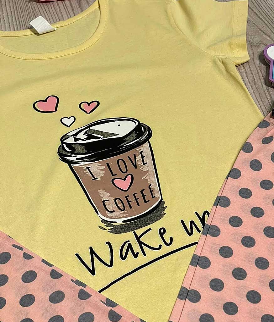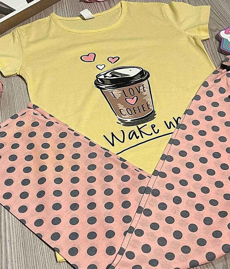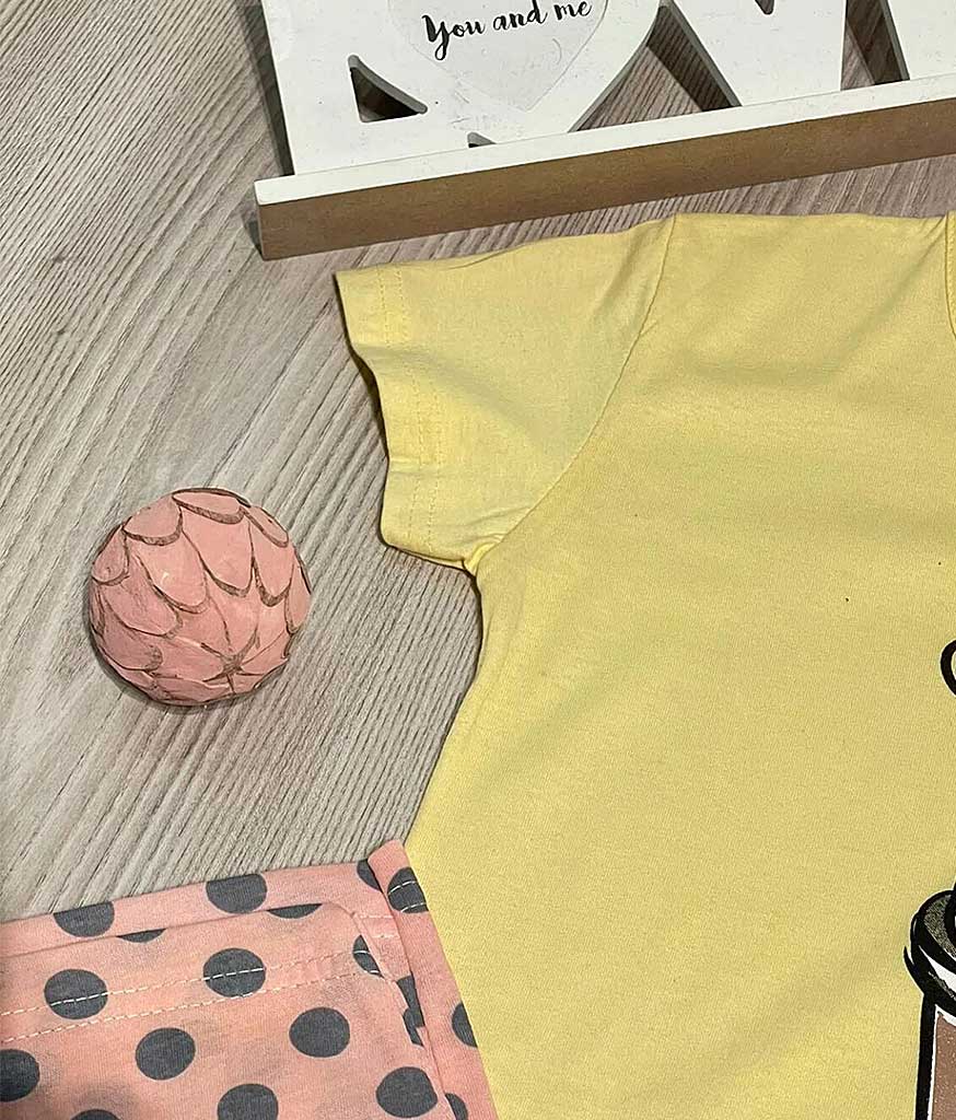Pijama Femei Pantaloni Lungi Galben/Roz din 100% bumbac de calitate superioară. Setul este compus din tricou cu imprimeu foarte calitativ și pantaloni lungi cu buline, este potrivită pentru sezonul rece.