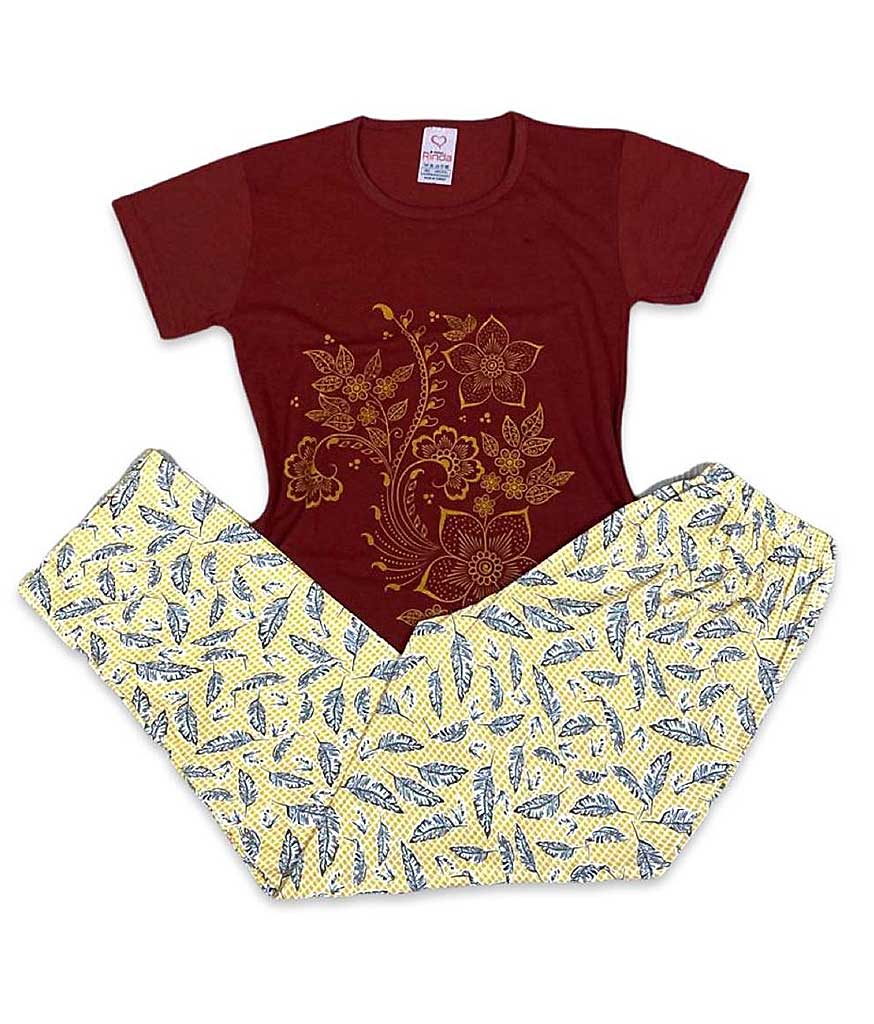 Descriere Pijama Femei Tricou Visiniu/Galben, material bumbac. Este lejeră, potrivită pentru sezonul rece și diminețile târzii