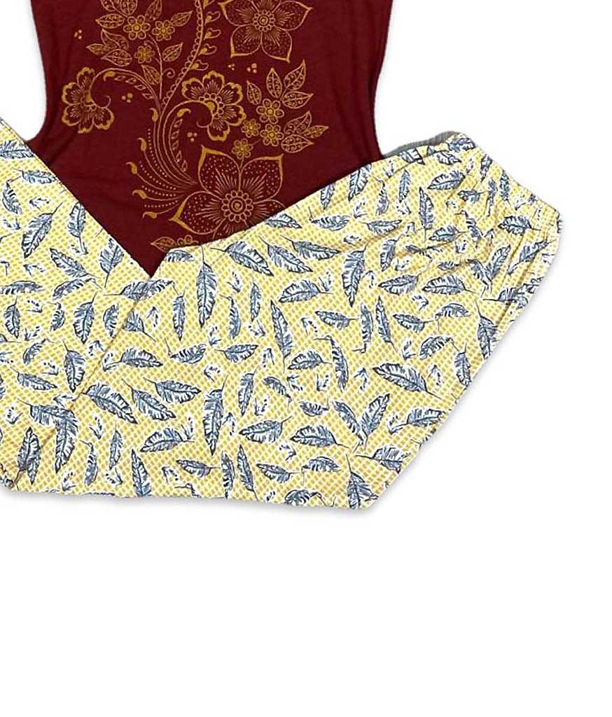 Pijama Femei Tricou Visiniu/Galben din 100% bumbac de calitate superioară. Setul conține tricou și pantaloni lungi lejeri, cu un imprimeu boem, elegant și de calitate. Este potrivită pentru momentele de relaxare din perioadele răcoroase.